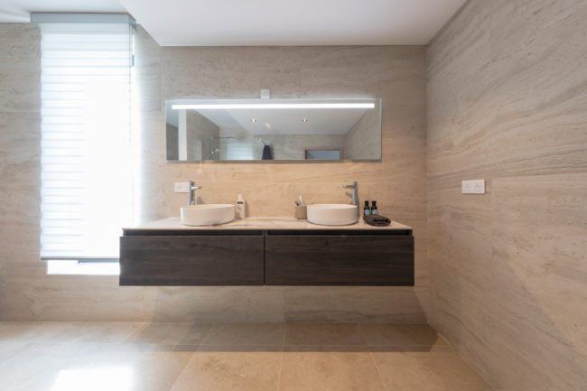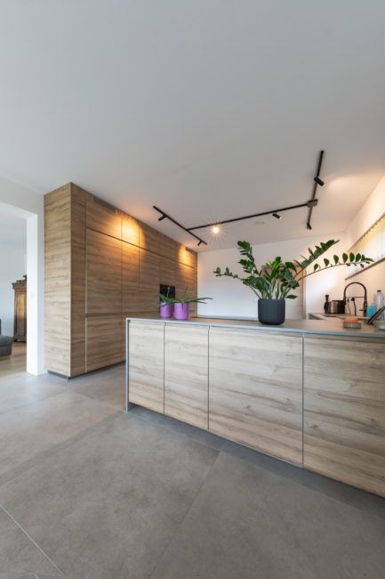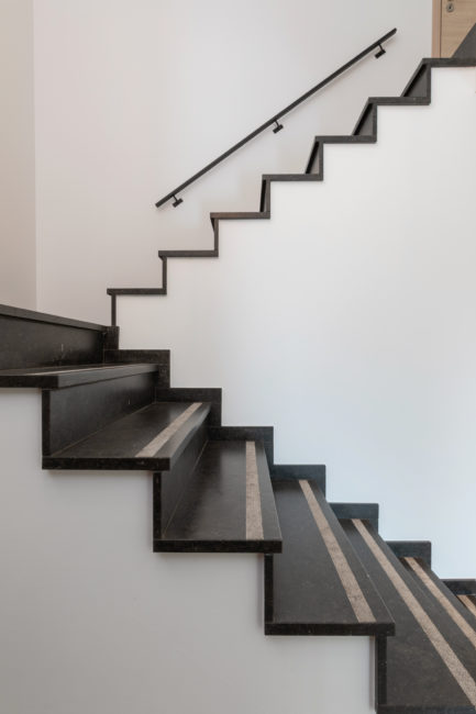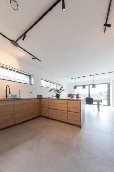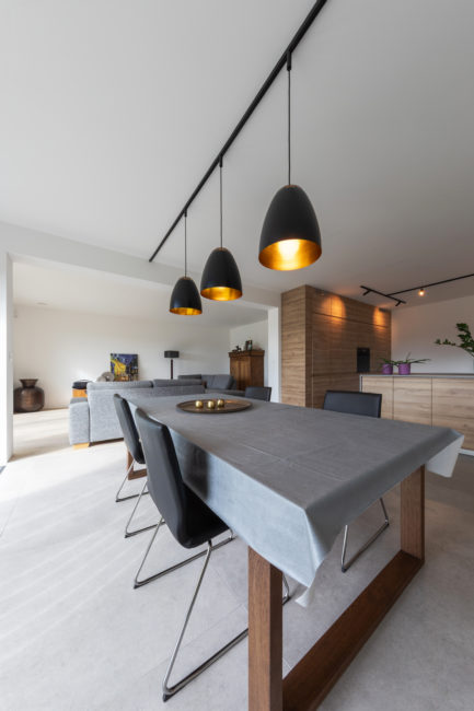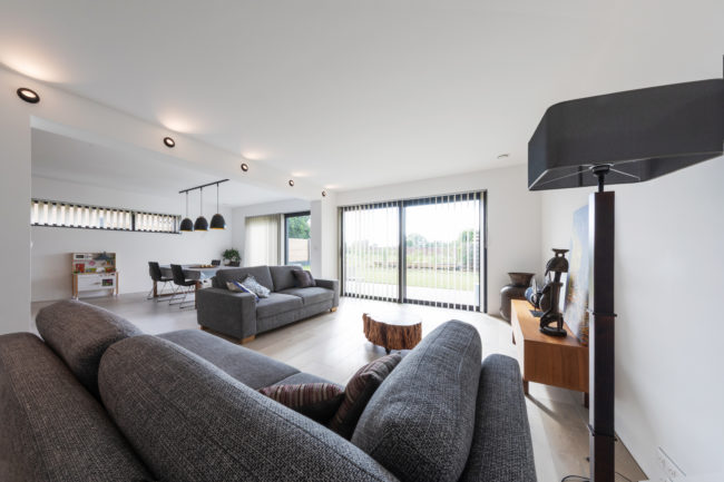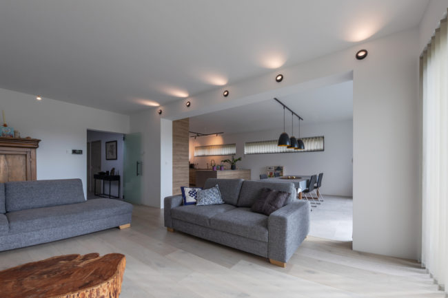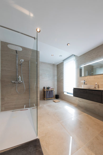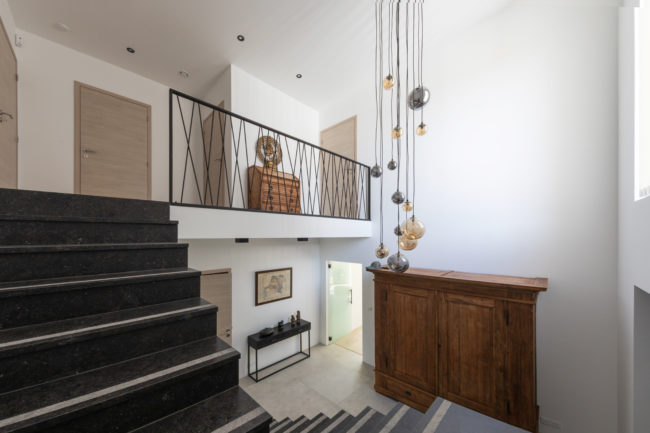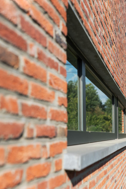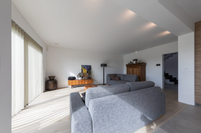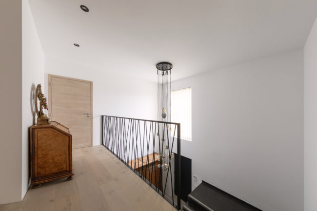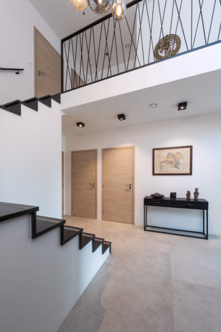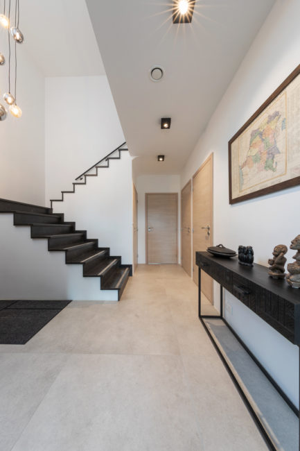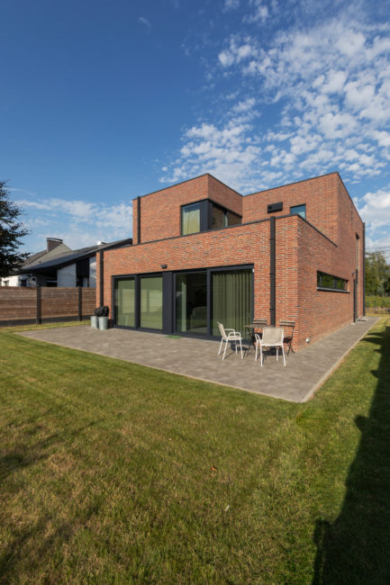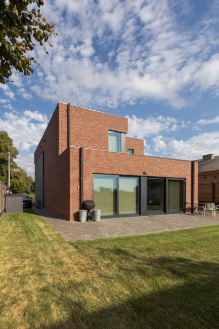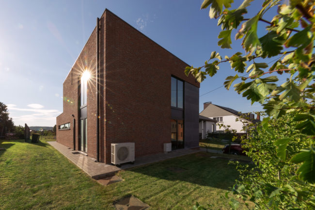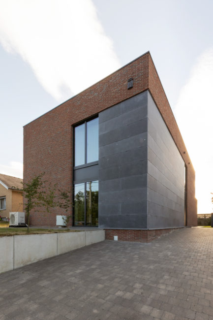 Habitation unifamiliale 4 façades, sur un petit terrain de 5 A, situé dans un quartier résidentiel et à proximité d’un centre villageois. Le souhait du maître de l’ouvrage était d’avoir une habitation compacte et rationnelle, tout en ayant une impression d’espace. Pour cela l’entrée se fait latéralement, via un hall distribuant les pièces de vie du rez-de-chaussée côté jardin, et une zone de nuit côté avant. Ce hall « cathédrale » dessert également l’étage via un escalier épuré, très graphique. L’effet de grandeur provient principalement de ce hall ouvert sur deux niveaux, incluant la circulation de l’étage. L’utilisation des mêmes matériaux et teintes sur l’ensemble de l’habitation renforce l’unité du lieu. Au niveau de l’aspect extérieur, le souhait s’est porté sur la simplicité des matériaux traditionnels s’exprimant au travers de ce cube sculpté. Les différents décrochements de façades et de niveaux permettent de faire entrer un maximum de lumière et de créer différentes perspectives, tout en conservant une certaine intimité.