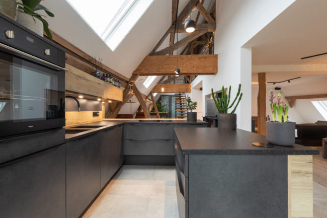 Le projet consiste en la restructuration du volume toiture d’une grange en un duplex. La volonté du maître de l’ouvrage a été de créer un logement dans un volume tel qu’il existait à la base. Pour cela, le projet s’est développé autour, à travers, en-dessous, en lien avec la charpente existante. Cette construction de bois structure l’espace, tant horizontalement que verticalement, permettant des liaisons et engendrant des perspectives mais également crée une certaine intimité pour certaines zones. Afin de garder une perception globale des fermes de charpentes, les interventions actuelles se veulent sobres, ce qui permet de magnifier cette superbe structure.