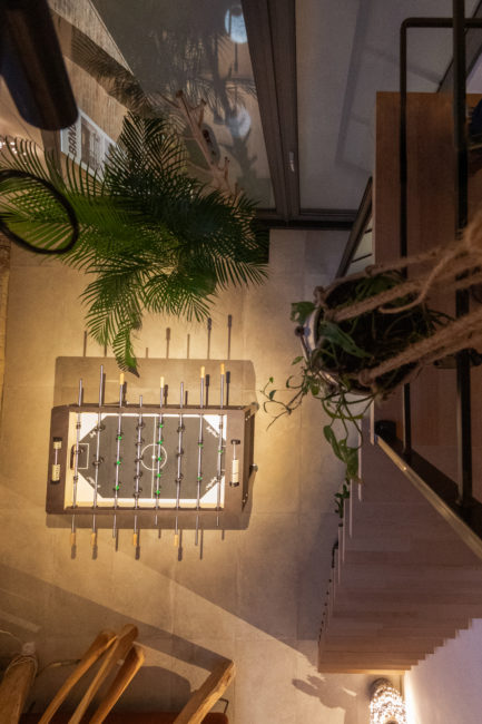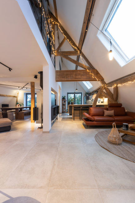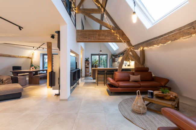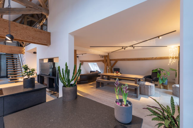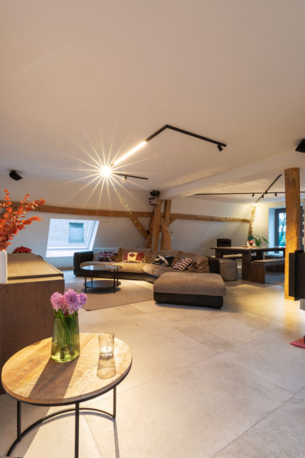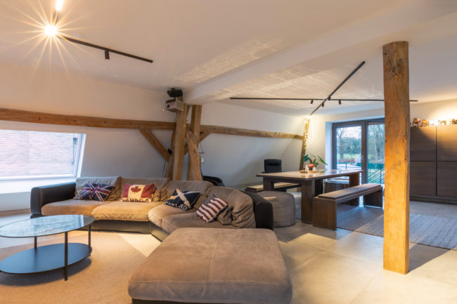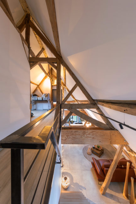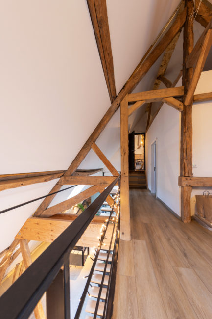 Le projet consiste en la restructuration du volume toiture d’une grange en un duplex. La volonté du maître de l’ouvrage a été de créer un logement dans un volume tel qu’il existait à la base. Pour cela, le projet s’est développé autour, à travers, en-dessous, en lien avec la charpente existante. Cette construction de bois structure l’espace, tant horizontalement que verticalement, permettant des liaisons et engendrant des perspectives mais également crée une certaine intimité pour certaines zones. Afin de garder une perception globale des fermes de charpentes, les interventions actuelles se veulent sobres, ce qui permet de magnifier cette superbe structure.